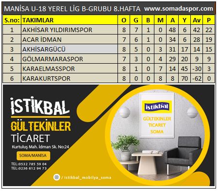 Karaelmasspor, Akhisargücü, Akhisar Yıldırımspor, Gölmarmaraspor, Acar İdmanyurdu ve Karakurt Gençlikspor'un yer aldığı Manisa U-18 Futbol Ligi A-grubunda puan durumu ve fikstür: