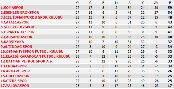 Somaspor, TFF 3.Lig 3.Grup 29.hafta maçında İçel İdmanyurdu'nu 1-0 mağlup etti ve liglerin bitimine beş hafta kala en yakın rakibi Erokspor ile arasındaki puan farkını beşe çıkardı.