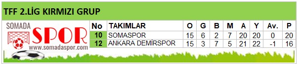 Geçtiğimiz hafta sahasında Erbaaspor ile 1-1 berabere kalan Somaspor, 20 puanla 10. sırada yer alıyor. Rakip Ankara Demirspor ise deplasmanda Giresunspor ile 2-2 berabere kalarak puanını 16'ya yükseltti ve 12. sırada bulunuyor.
