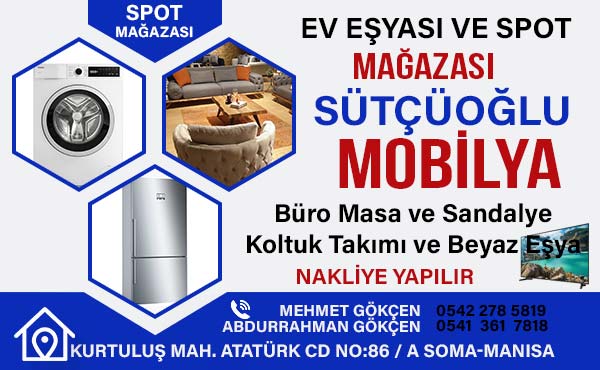 SÜTÇÜOĞLU MOBİLYAEV EŞYASI VE SPOT MAĞAZASI Spot ve 2. El tüm Eşyalarınız Nakit Değerinde Alınır, Satılır. Oturma Grubu, Beyaz Eşya, Yatak Odası Takımı, Yemek Masası, Büro Masa ve Sandalye, vs. Tüm Ürünleriniz Değerinde Alınır, Satılır. Ayrıca Nakliye Yapılır TEL: Mehmet Gökçen 0542 278 5819- Abdurrahman Gökçen 0541 361 7818 ADRES: KURTULUŞ MaH. ATATÜRK CD NO:86 / A SOMA-manisa
