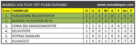İlk ikiye girip, Türkiye Şampiyonası'na katılmak isteyen Soma 301 Karaelmasspor, play-off’un ikinci maçında bugün (p.tesi) oynadığı Manisa Yıldızspor 45 Futbol Kulübü’ne 3-1 mağlup oldu..